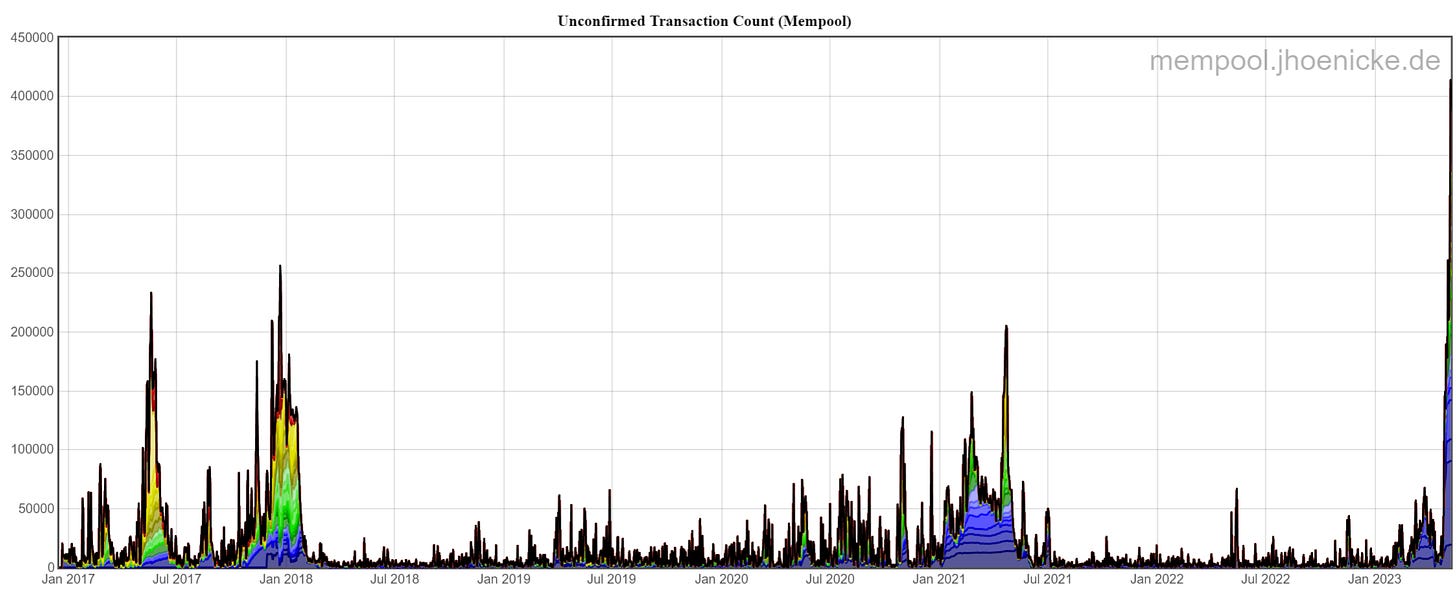 Con la llegada de Ordinals a Bitcoin, algunos entusiastas de las cripto vieron la oportunidad de recrear memecoins de Ethereum en la red de Bitcoin y lanzarlas al mundo. Estas copias no oficiales llevan el mismo ticker que las originales y crearon tanto hype que hicieron saturar la red con transacciones sin completar llegando a más de 400.000 subiendo con ello los fees/trx, llevando a Binance a suspender las transacciones el domingo
